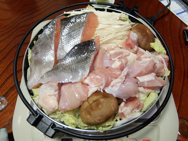と云う事で今日は、鮭・鶏肉・白菜・椎茸・シラタキ・等で寄せ鍋です。