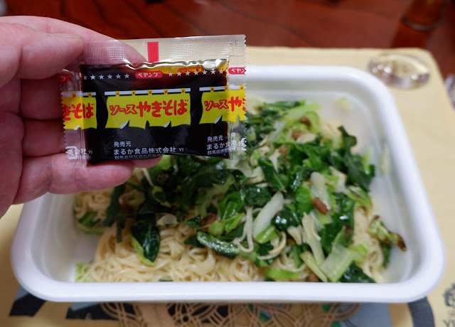 焼きそばと云う名の<茹でそば>の、水っぽさは消えている! これこそ焼きそばだろう! それではこの後は、元々のカップ焼きそばの作り方で・・・